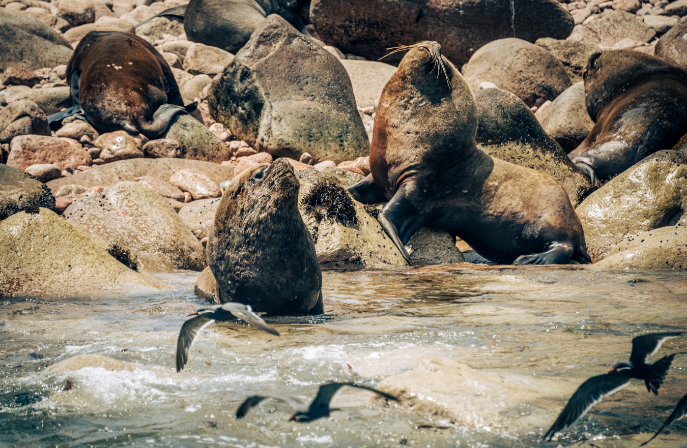 Also inhabiting the islands are South American fur seals. Gray or tan and smaller than sea lions, fur seals prefer to lounge on rocky shores where cliffs provide shaded areas. Females are much smaller and typically weigh between 65 and 130 pounds (30 and 60 kg). Male South American fur seals weigh up to 440 pounds (200 kg).