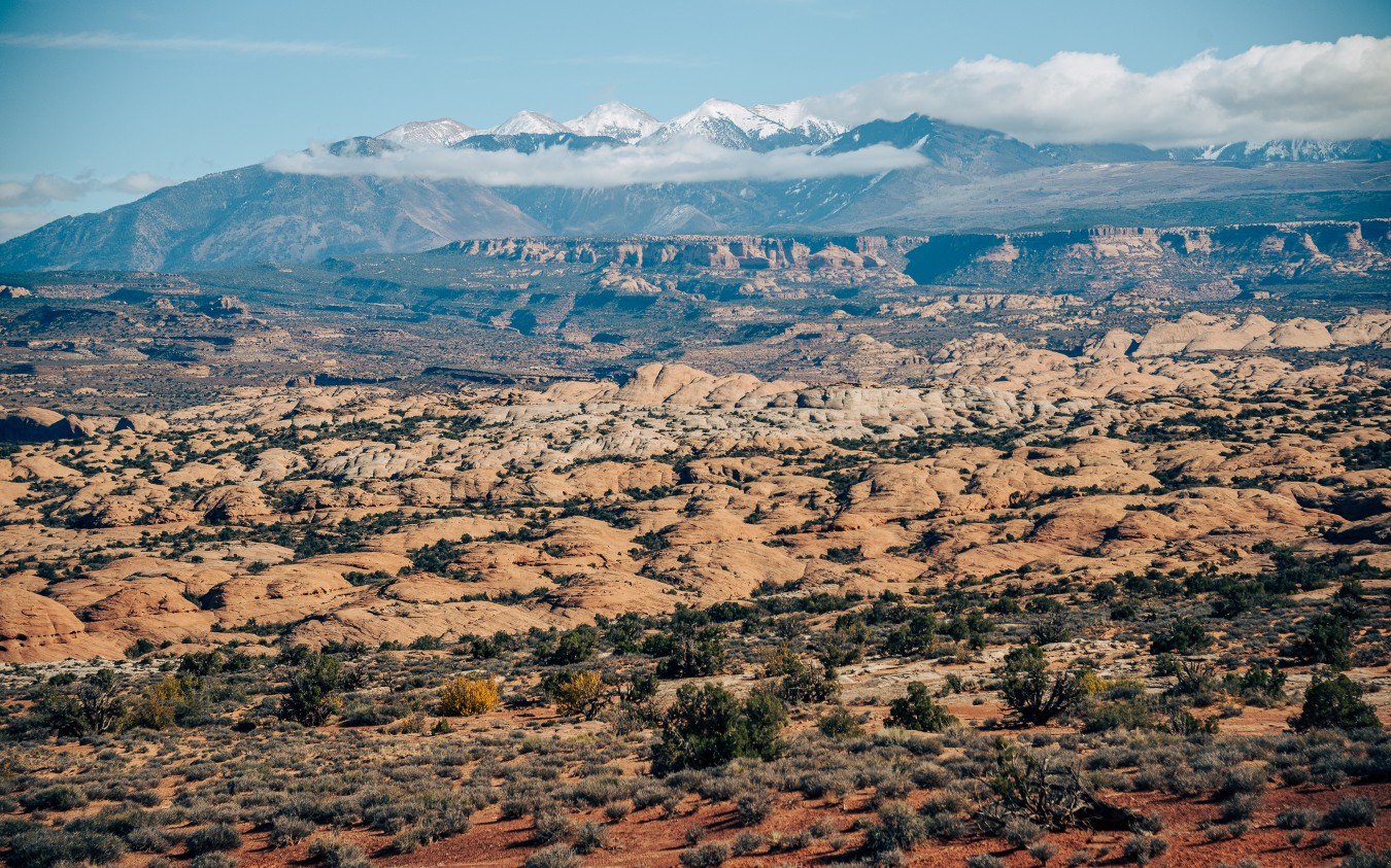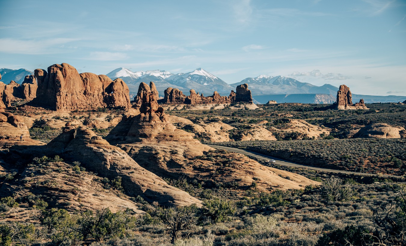Arches National Park in Moab offers the largest density of natural sandstone arches in the world. Visitors can enjoy biking, camping, rock climbing, and hiking. Positioned in a “high desert” with elevations ranging from 4,085 to 5,653 feet above sea level in southeast Utah, Arches National Park contains over 2,000 natural sandstone arches! Throughout the park, rock layers reveal millions of years of deposition, erosion, and other geologic events.